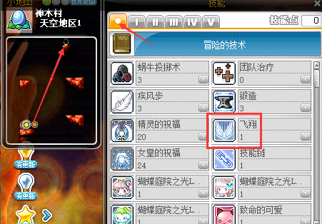 使用新手技能中的飞翔,角色进入飞翔模式,然后清除地图中所有怪物,飞向右上方传送门进入下一阶段。